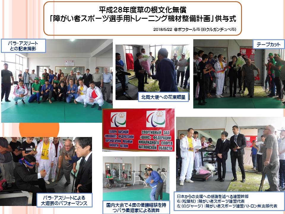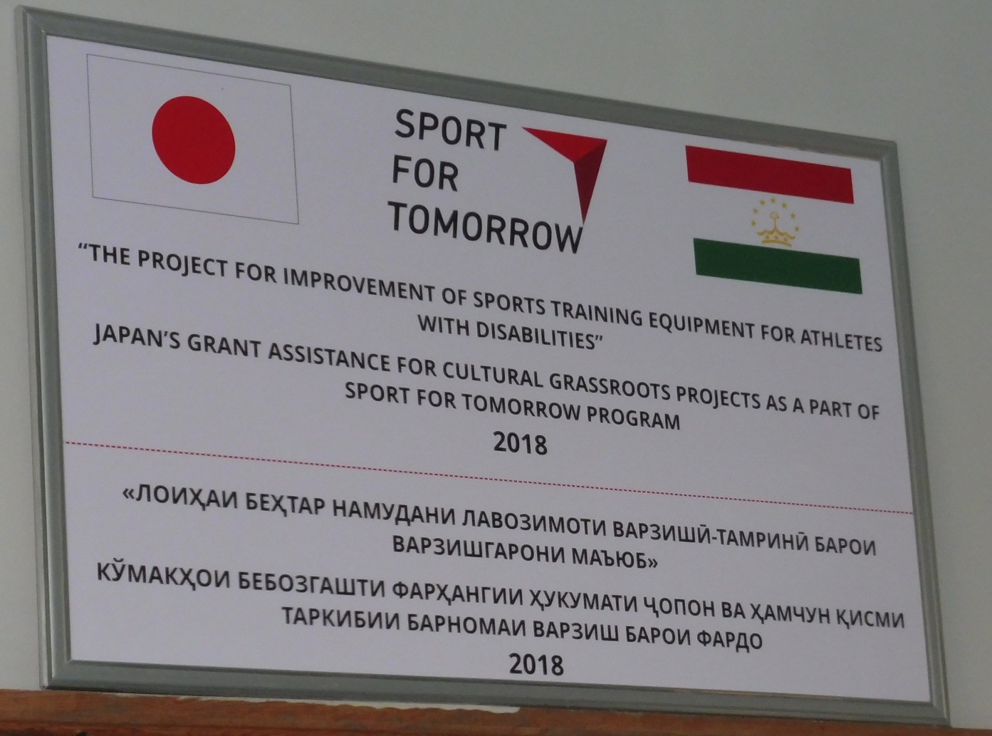 5月22日、南部ハトロン州の州都ボフタル市(クルガン・チュベ市改め)で、日本政府による草の根文化無償資金協力で「タジキスタン障がい者スポーツ連盟」に対する、障がい者スポーツ選手用トレーニング機材の供与が行われました。ボフタル市を含む、タジキスタンの4都市の障がい者施設に、競技用車椅子、柔道マット、その他の機材を供与するという計画で、これは東京オリンピックとパラリンピックが開催される2020年までに全世界でスポーツを振興しようという日本の「スポーツ・フォー・トゥモロー」計画の一環として行われたものです。