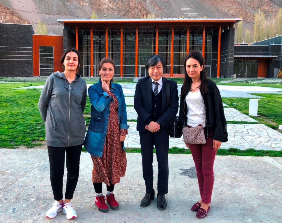 4月15日、北岡大使は、四度目の東部ゴルノ・バタフシャン自治州訪問を開始。四日目には、州都ホログにある昨年竣工したばかりのイスマイリ・センターを視察しました。自治州には、全世界で最大のイスラム教イスマイル派のコミュニティがあります。大使はガイドのママダストヴァ女史の案内で、前後を山と河に挟まれ、パミールの豊かな自然を感じさせる恵まれた立地に、現地の石材のみを使用して完成した壮麗な建物を鑑賞。正装したイスマイル派のボランティアが多数参集し、助け合いながら夕暮れの祈りの準備を行っているのが印象的でした。