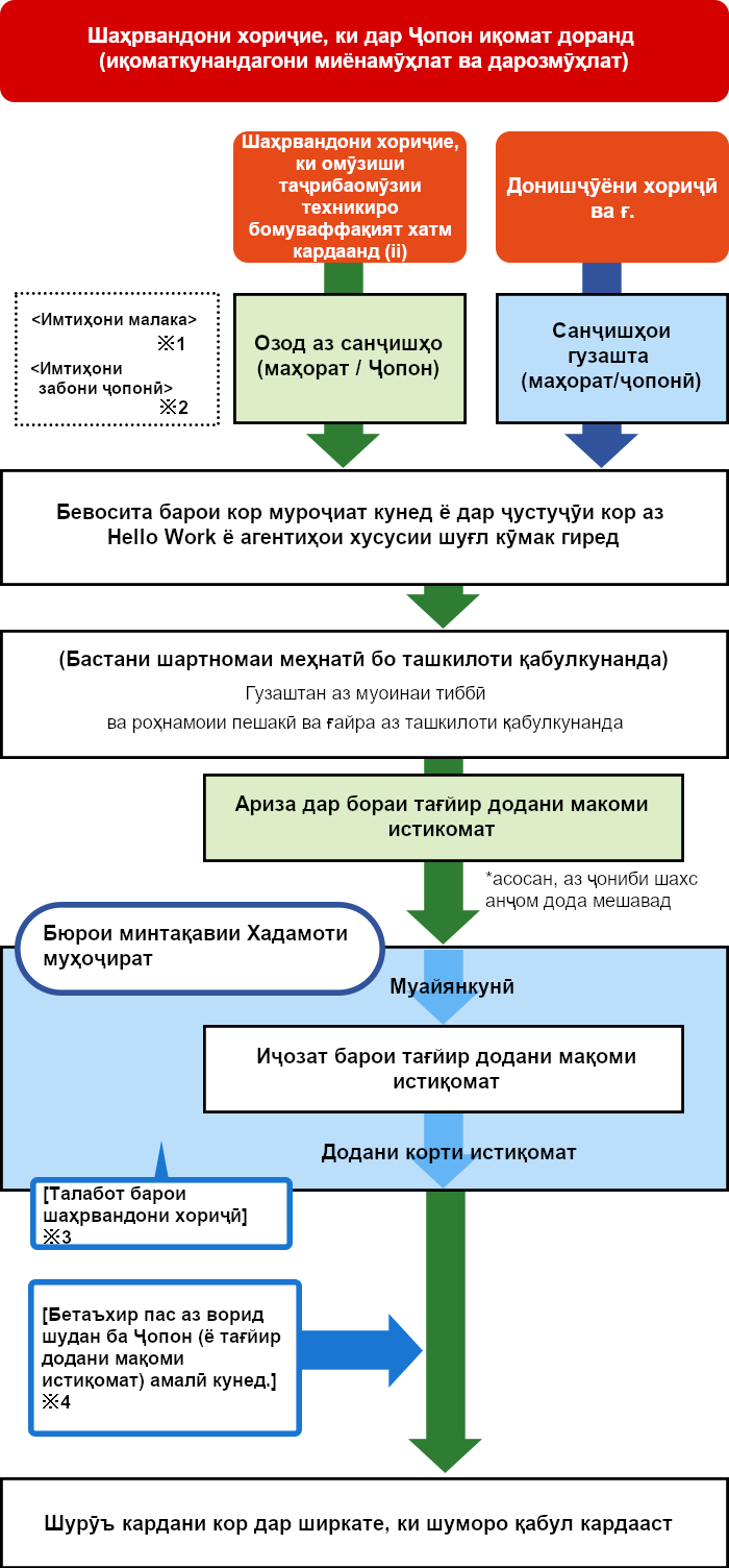 Барои дарёфти мақоми иқомати «Мутахассиси соҳибмалакаи махсус» (Specified Skilled Worker), гузаштан аз имтиҳонҳои малакаи касбӣ вобаста ба ҳар як соҳаи муайяни саноатӣ зарур мебошад. Ин имтиҳонҳо ҳам дар дохили Ҷопон ва ҳам дар хориҷи он баргузор мегарданд.